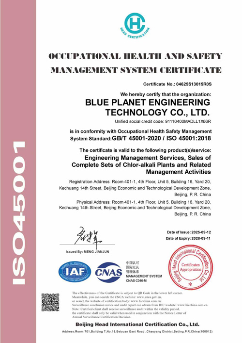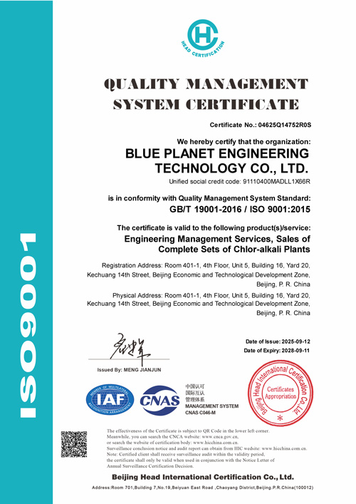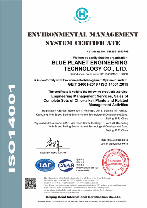 Somos BPC (BLUE PLANET ENGINEERING TECHNOLOGY CO., LTD), una empresa de ingeniería global que integra ingeniería, tecnología, servicio y comercio internacional. Nos centramos en el suministro de soluciones integradas para plantas de cloroalcal, tecnologías de soporte de flujo ascendente y descendente, así como contratación general EPC. Somos el líder de China para la comercialización en el extranjero y negocios de ventas, así como una plataforma para proporcionar tecnología y servicio para clientes globales de clor-álcali.